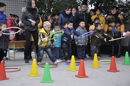 上午九点活动正式开始,家长和幼儿已早早地排好了队。活动场地热闹非凡,快乐在每一个场地传播。“运果果”是由幼儿夹住沙包跳过5个圈,家长又夹着沙包跳回来,激烈的竞争让喜悦荡漾在孩子和家长的脸上; “快乐小推车”游戏的幼儿坐在车中,由家长推车到对面抱一个球,再推着幼儿返回起点,笑声、欢呼声回荡在欢快的场地上;亲子二人行、弹珠接力赛、粘小鱼活动又是别一样场景、别一样的笑声,但快乐都是一样的。
