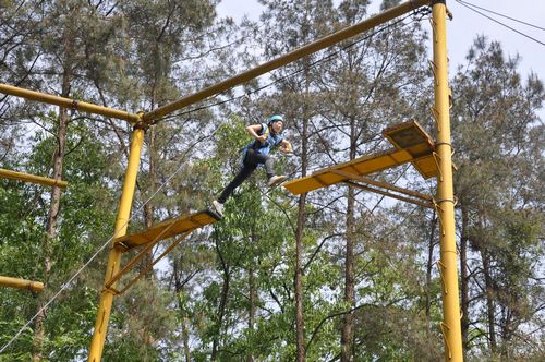 23日上午,从简阳乘车到达蒲江训练基地后,在培训中心的教练组织下,员工们随即展开了培训活动。经过简短、有趣的开场活动,参加培训的青年员工被分为5个小组先后参加了高空断桥、信任背摔、勇闯三关和鼓动人心等活动。