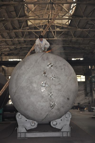 今年,容器公司的一个重点项目就是CS2120D一百二十立方米卧式液氢槽车的制作,其技术难度非常大,堪称是一次前所未有的“遭遇战”。对于这项艰巨的任务,擅打硬仗的蔡于、朱德意作业组当仁不让,勇挑重担。一接手,他们首先面临的是施焊的难题。该产品内筒母材含有16MN,所需焊丝特别软,给焊接带来相当大的难度。面对难题,焊工师傅们迎难而上。大家集思广益,谨慎施焊,每一个坡口都认真清理,每一条焊道都仔细修磨,每一处施焊都小心翼翼,精益求精中,焊缝照光一级片合格率超过了百分之九十,为产品前期的顺利进行打下了一个坚实地基础。一百二十立方米卧式液氢槽车后期套装的难点是安装的衔接。冷作工师傅一边制作的同时一边与相关的设计工艺人员一道交流探讨最佳方案。内筒管路的走向、套管排位的选择、支架装配的定位等无不考验着人们本已紧绷的神经。压力下,大家并没有沮丧与退缩,而是实实在在地迈开了进取的脚步。几番上下的装拆,几番探索的尝试,几番纠结的交错,终于,90度支架顺利地安装到位,几十处支脚的焊接也圆满无缺,无一漏点,从而有效地保证了氦检与抽真空的正常进行。