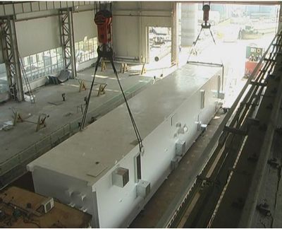 为了满足墨西哥CRYOINFRA公司的要求,减少现场安装工作量,缩短交货期,浙江大川公司决定8000空分主冷箱采用整体方式出厂。与之前采用的两段式的出厂方式相比较,可大幅减少现场工作量。但由于冷箱的体积大,尺寸为长51米、宽6.5米、高5.9米,重量200吨,属于超大件运输,大川公司没有类似设备的运输经验。京杭大运河一般船长约50米左右,该冷箱需要采用长69.8米、总吨位992吨的海船进行运输。海船在大川码头装船后,经内河运至上海港,转驳海船运到墨西哥。