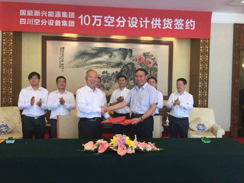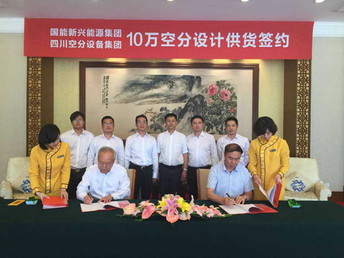 2015年7月22日12时28分,四川空分设备(集团)有限责任公司与国能新兴能源集团10万空分设计供货合同签约仪式在北京钓鱼台国宾馆成功举行。出席签约仪式的有国能新兴能源集团公司董事长王光明先生、四川空分设备(集团)有限责任公司董事长单金铭先生、副总经理李成旭先生、谢波先生等,以及国能新兴能源集团公司副总经理宋笠华先生、韩丹丹女士。