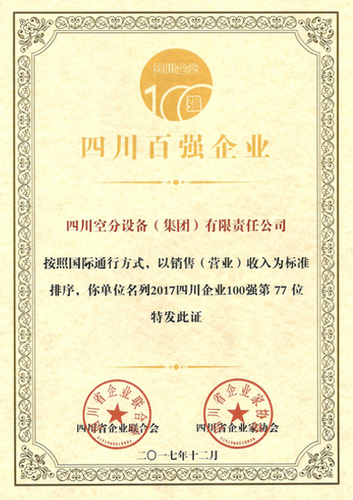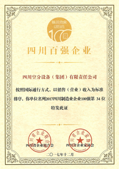 近日,我公司再次被四川省企业联合会、四川省企业家协会评为四川百强企业。按照国际通行方式,以销售(营业)收入为标准排序,我公司名列2017四川制造业企业100强第34位、2017四川企业100强第77位。