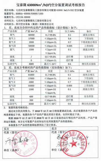 2018年12月,由四川空分集团承建的七台河宝泰隆煤化工股份有限公司63000 Nm3/h特大型空分装置一次开车成功并达产运行,各项产品性能参数达到或优于设计指标,单位产品运行能耗达到行业先进水平。