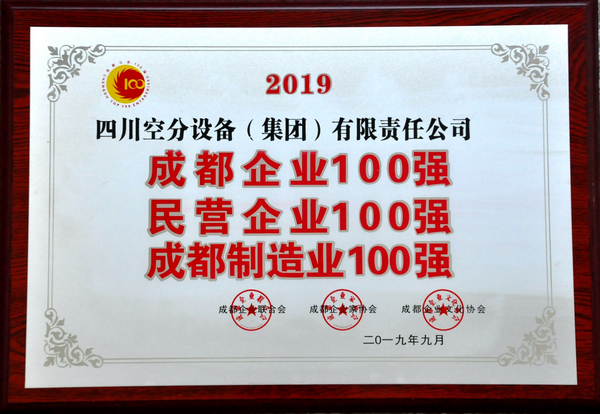 参照全球企业500强及中国企业500强的评选方式,我公司被成都企业联合会、成都企业家协会、成都企业文化协会评选为成都百强企业、成都制造业百强企业、成都民营百强企业。